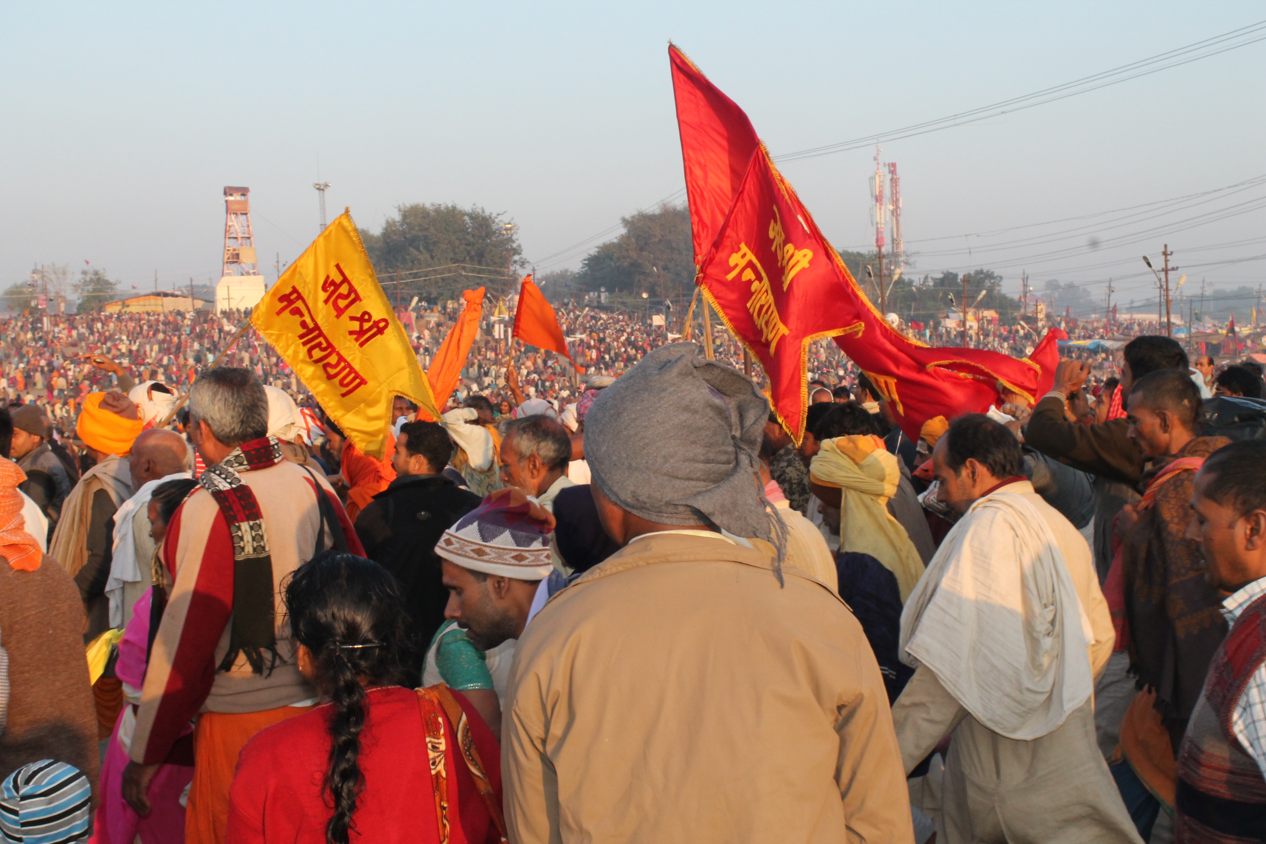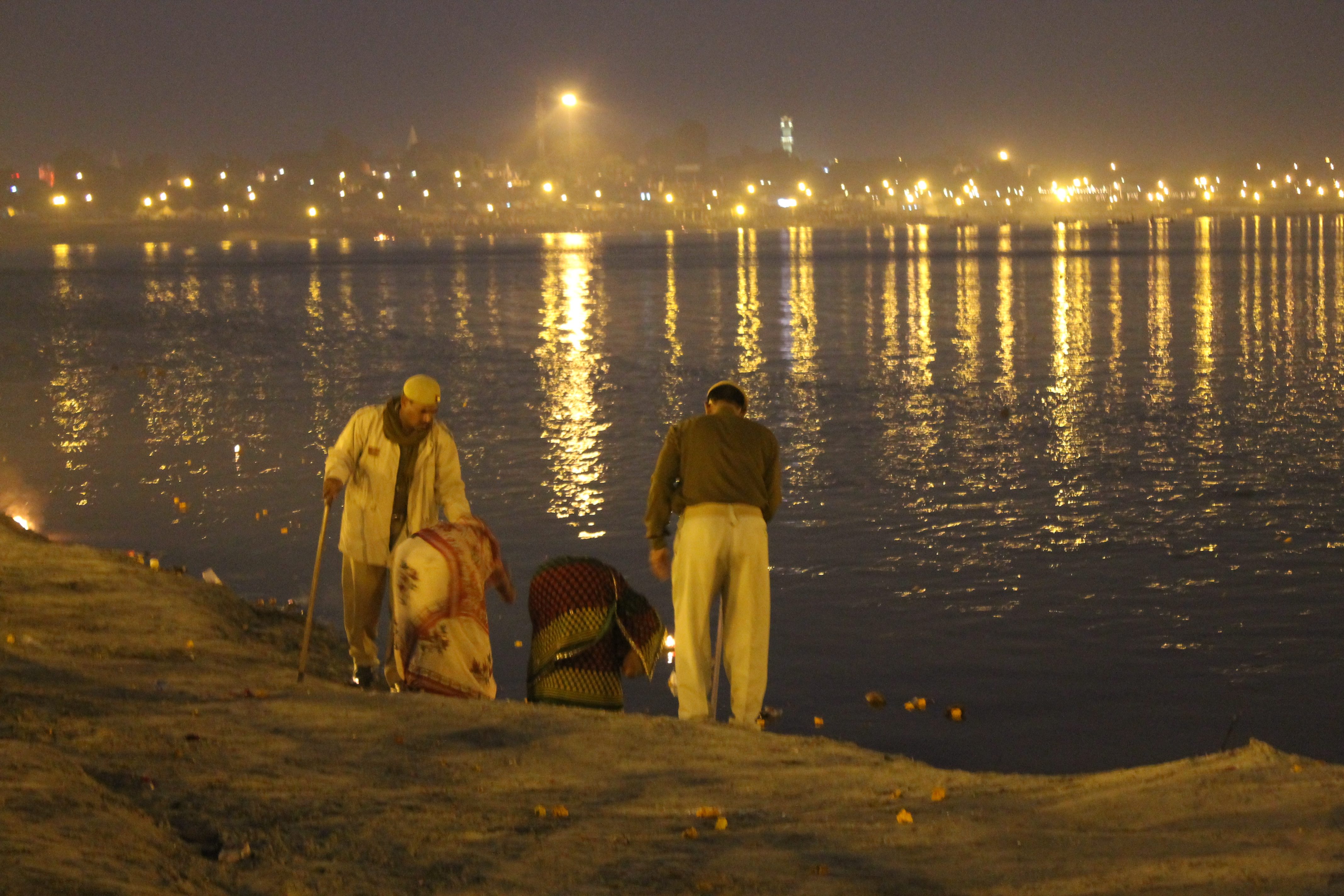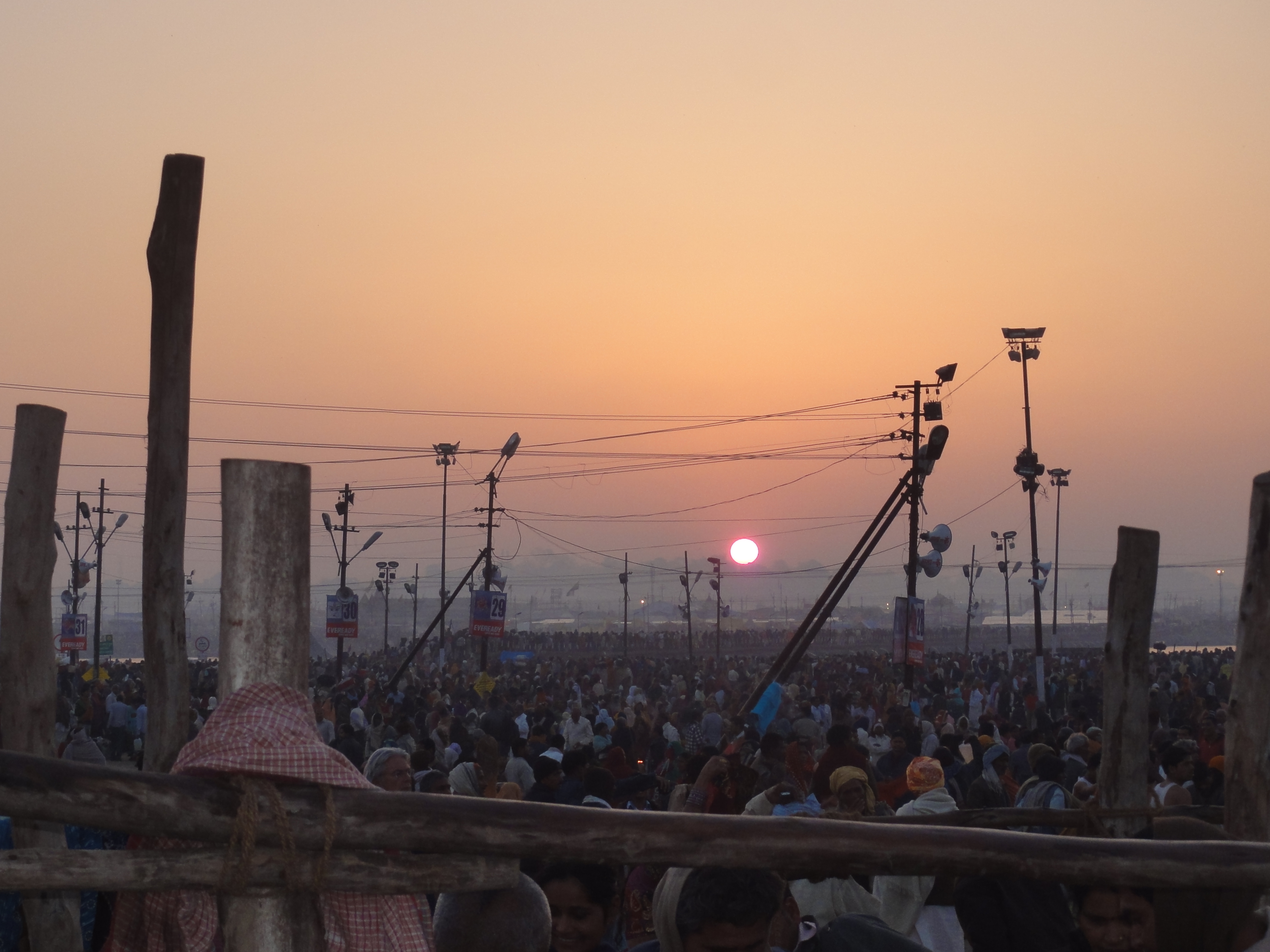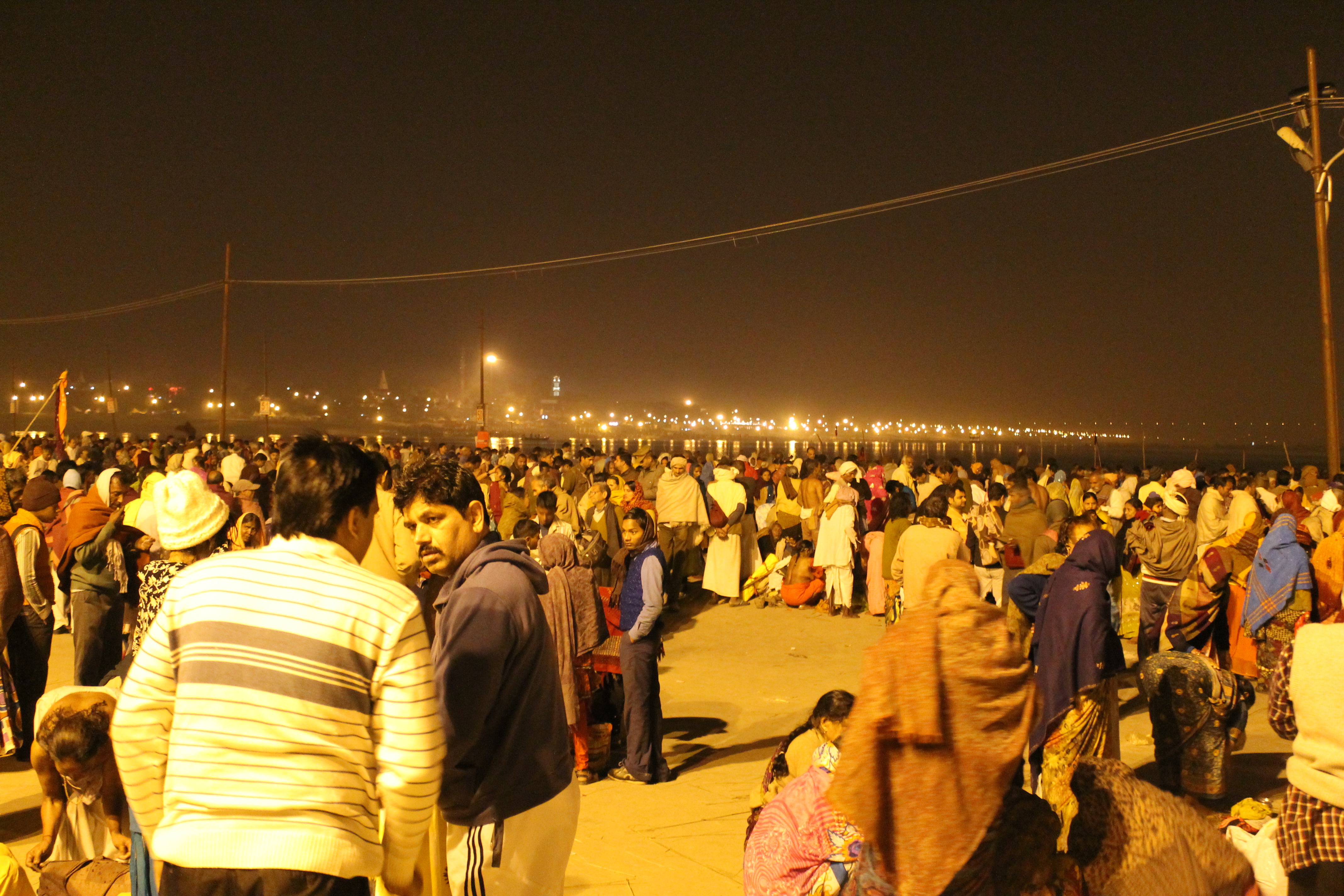 So, after taking the three-and-a-half hour taxi ride from Varanasi to Allahabad, arriving at 4am, we departed from the car, our taxi driver parking up to wait for us. In the dark we followed the masses down a long road, where no vehicles were allowed, to the Ganges. The walk took a little over an hour, and I was pretty surprised that considering the masses of people, there was hardly any noise. Many people, especially the women and the elderly were walking with no shoes, and they looked exhausted, and in pain. People were carrying large, heavy bags on their heads, which I am amazed about – surely it can’t be easier than carrying them? Maybe I will try it.