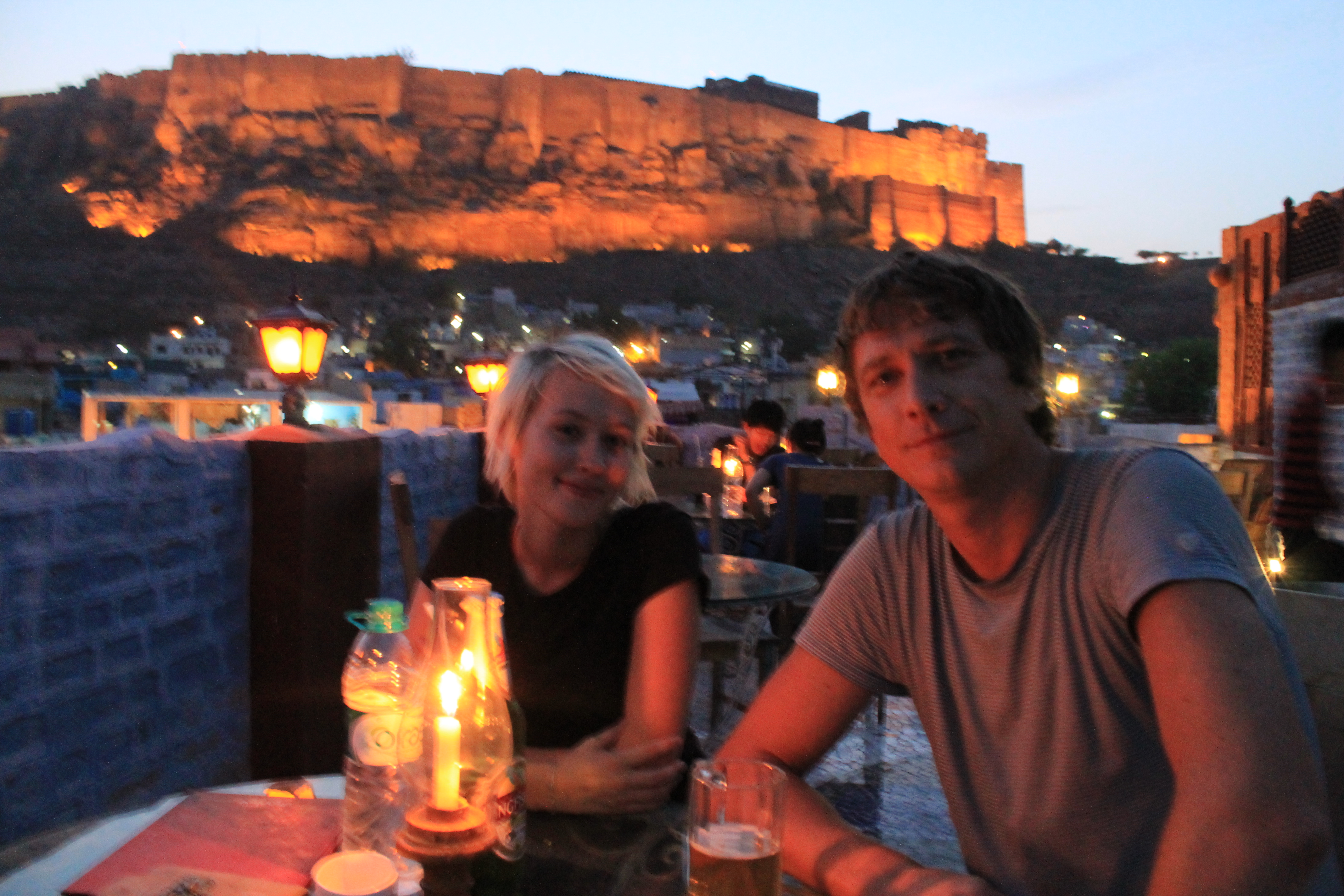 It was pretty late in the evening when we arrived by bus to Jodhpur (AKA Blue City). We checked in at Shivam Paying Guesthouse, which sits just at the bottom of Mehrangarh Fort’s walls, and were greeted with a smile by a young guy (the only one of the bunch who smiled at all). He took us to our already-paid-for room, but after discovering the ceiling fan didn’t work, he upgraded us to a pretty swanky room – much to the dismay of his boss who we heard shouting at him outside. I’d love to say that we had a good night’s sleep in here, but I was up all night taking cold showers, then laying down, then I’d heat up after 10 minutes and do the same thing… I was pretty knackered the next day! The guesthouse restaurant upstairs provides a good view of the tower clock which lights up in the evening and changes colour, in front of a colourful firework display.